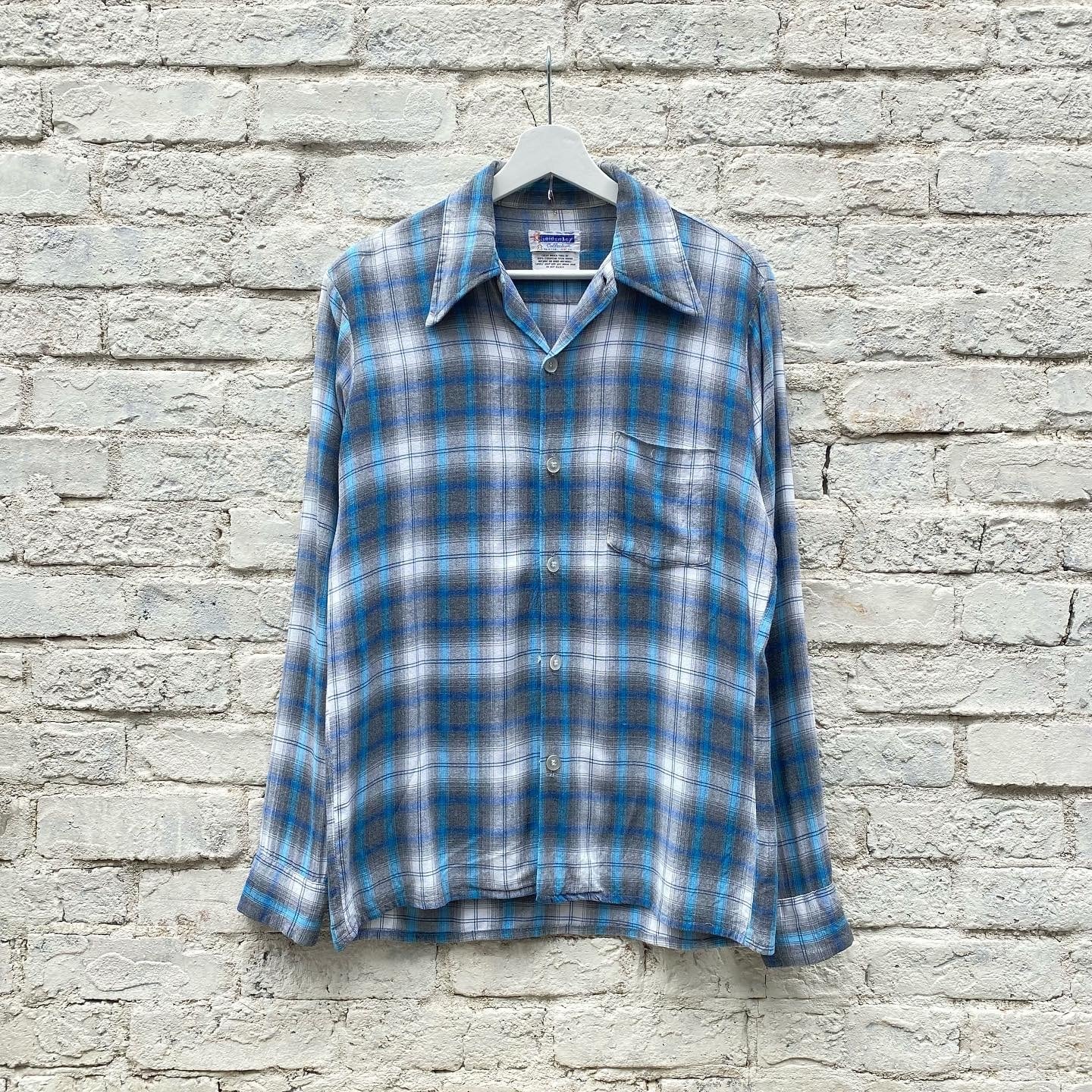 70s Goldenkey Ombre Check Rayon Shirt / vintage ビンテージ 古着 オンブレチェックレーヨンシャツ shadow シャドウ グレー 青 開襟 Arrow towncraft